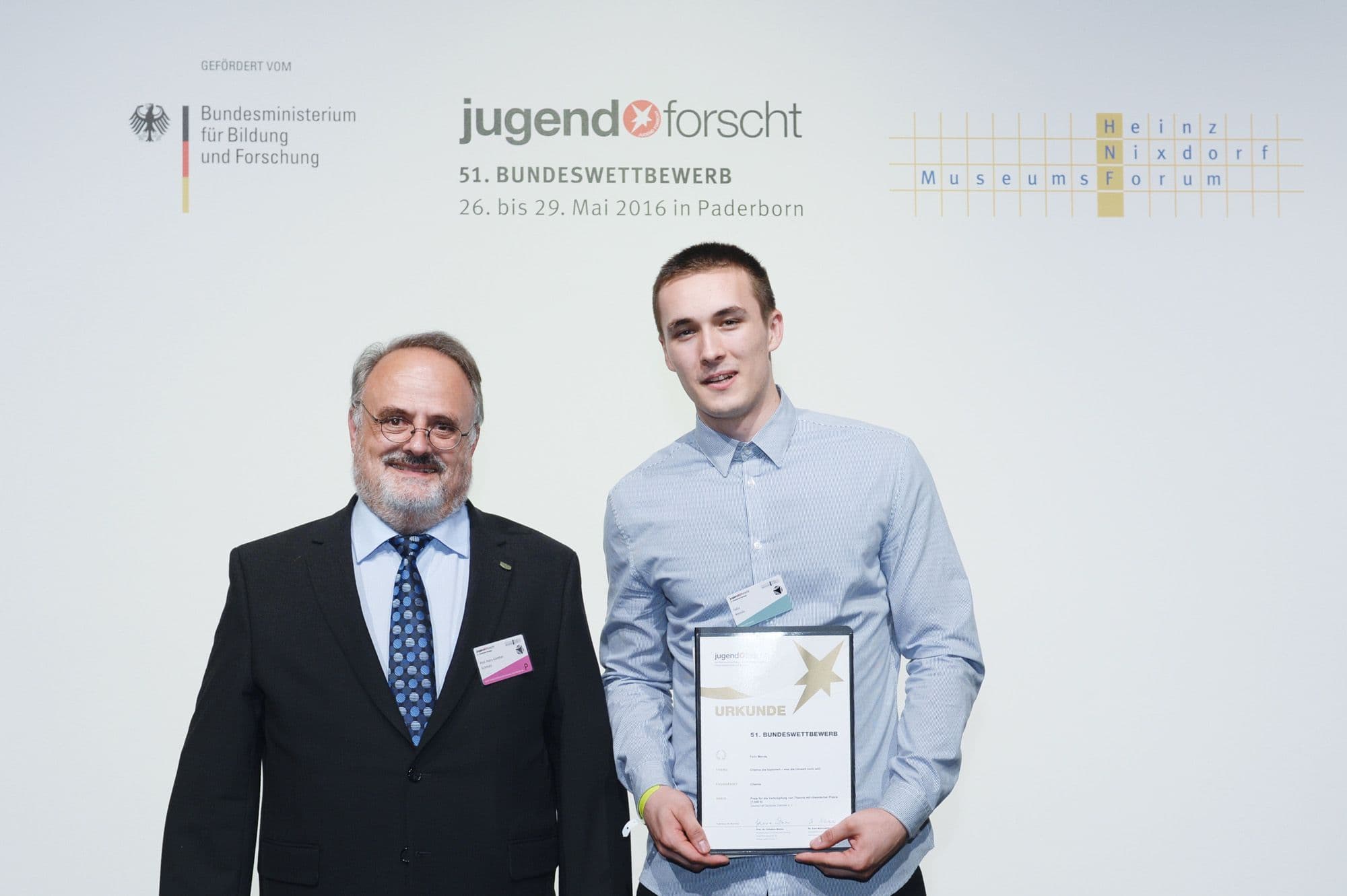 Die Jury überzeugte der Jungforscher mit seiner Kreativität und seinem fundierten Fachwissen. Mit seinem Projekt bewies er ein großes Maß der Eigenständigkeit und Zielstrebigkeit. Seine schriftliche Arbeit und auch seine Präsentation zeigten ein hohes wissenschaftliches Niveau.