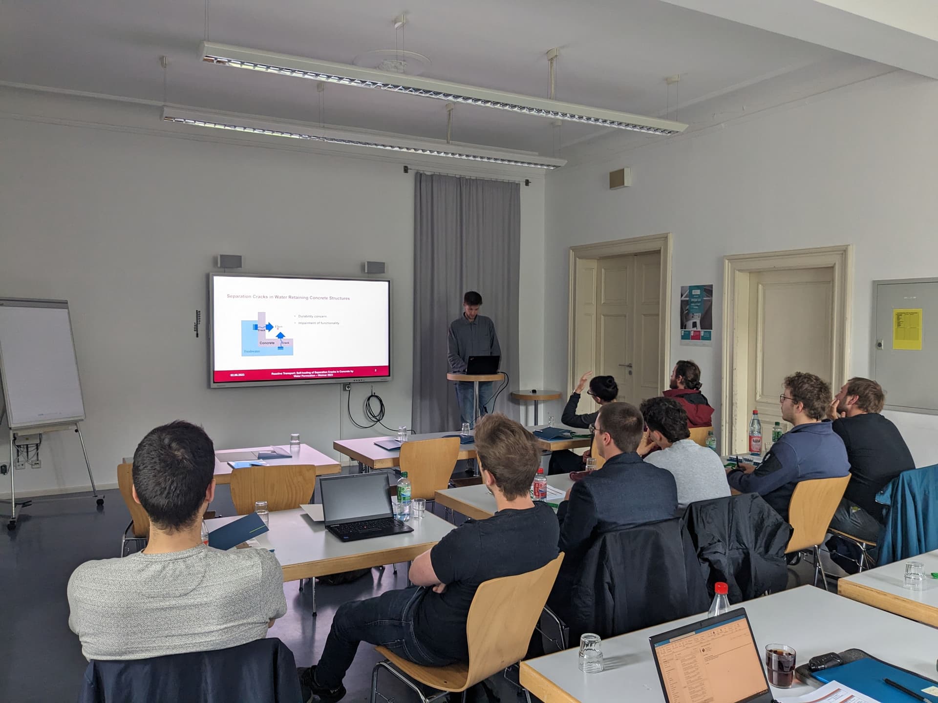 Das Promovierenden-Seminar Bauchemie 2023 fand auf dem Gelände der Europäischen Jugendbildungs- und Begegnungsstätte Weimar statt. Neun Promovierende nutzten diese Gelegenheit, um sich wissenschaftlich auszutauschen und ihre Promotionsthemen vorzustellen. Neben dem wissenschaftlichen Austausch standen ein Grillabend, ein nachmittäg­licher Spaziergang zu berühmten Bauhaus-Orten, ein Besuch im „Schmale Handtuch“ (eine Weimarer Institution, in der seit mehr als 100 Jahren Bier für Durstige – darunter auch viele Studierende – gezapft wird) und eine Führung durch die mit modernster Prüf- und Analysetechnik ausgestatteten Labore der Professur Bauchemie und Polymere Werkstoffe auf dem Programm.