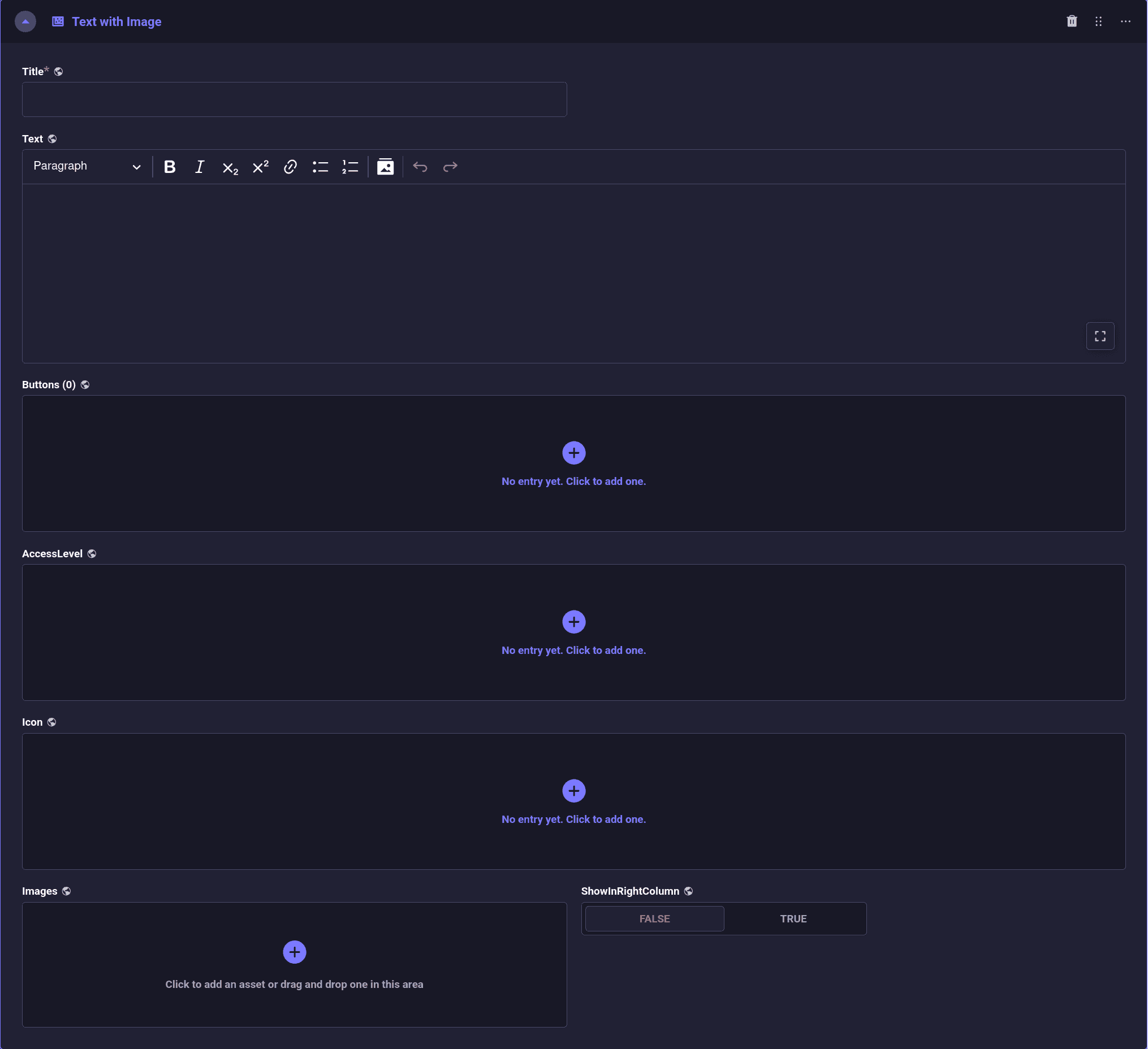 Die einfachste Form eines Inhaltselements ist „Text with Image“. Das wird in 90% der Fälle verwendet werden, weil es sehr gut mit dem dreispaltigen Layout auf dem Desktop funktioniert und Basisfunktionalität für die Darstellung von Texten liefert. Es können ein Icon, Titel, Bilder, Buttons und Zugriffsberechtigungen festgelegt werden.
