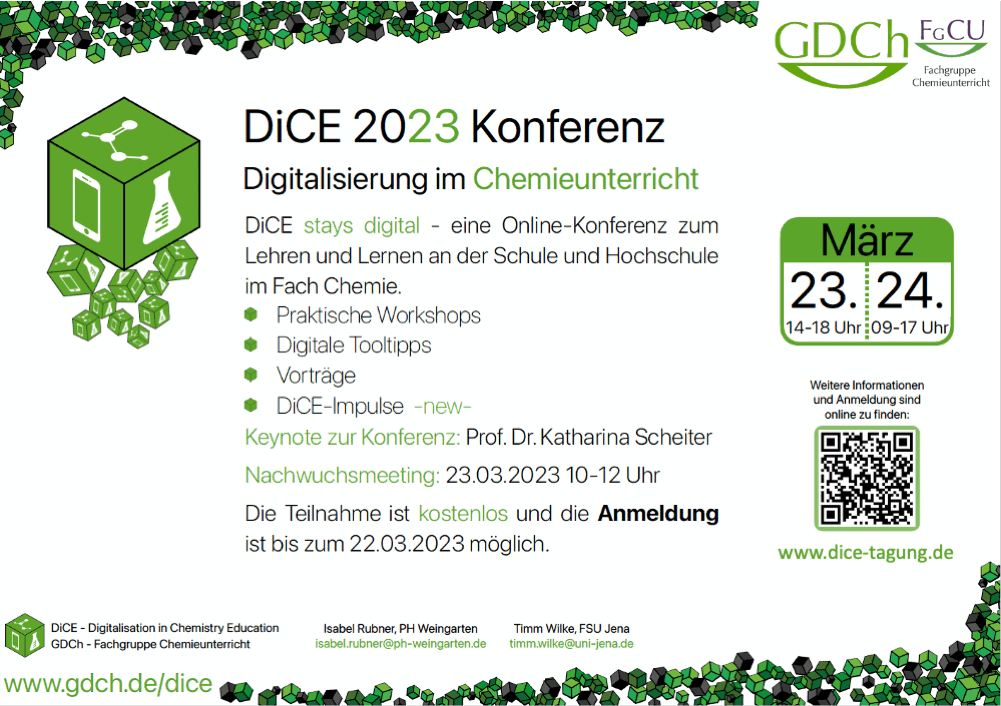 Die AG Digitalisierung im Chemieunterricht richtet vom 23.-24. März 2023 die nächste DiCE-Tagung aus. Alle weiteren Informationen finden Sie im unten aufgeführten Flyer und unter: www.dice-tagung.de