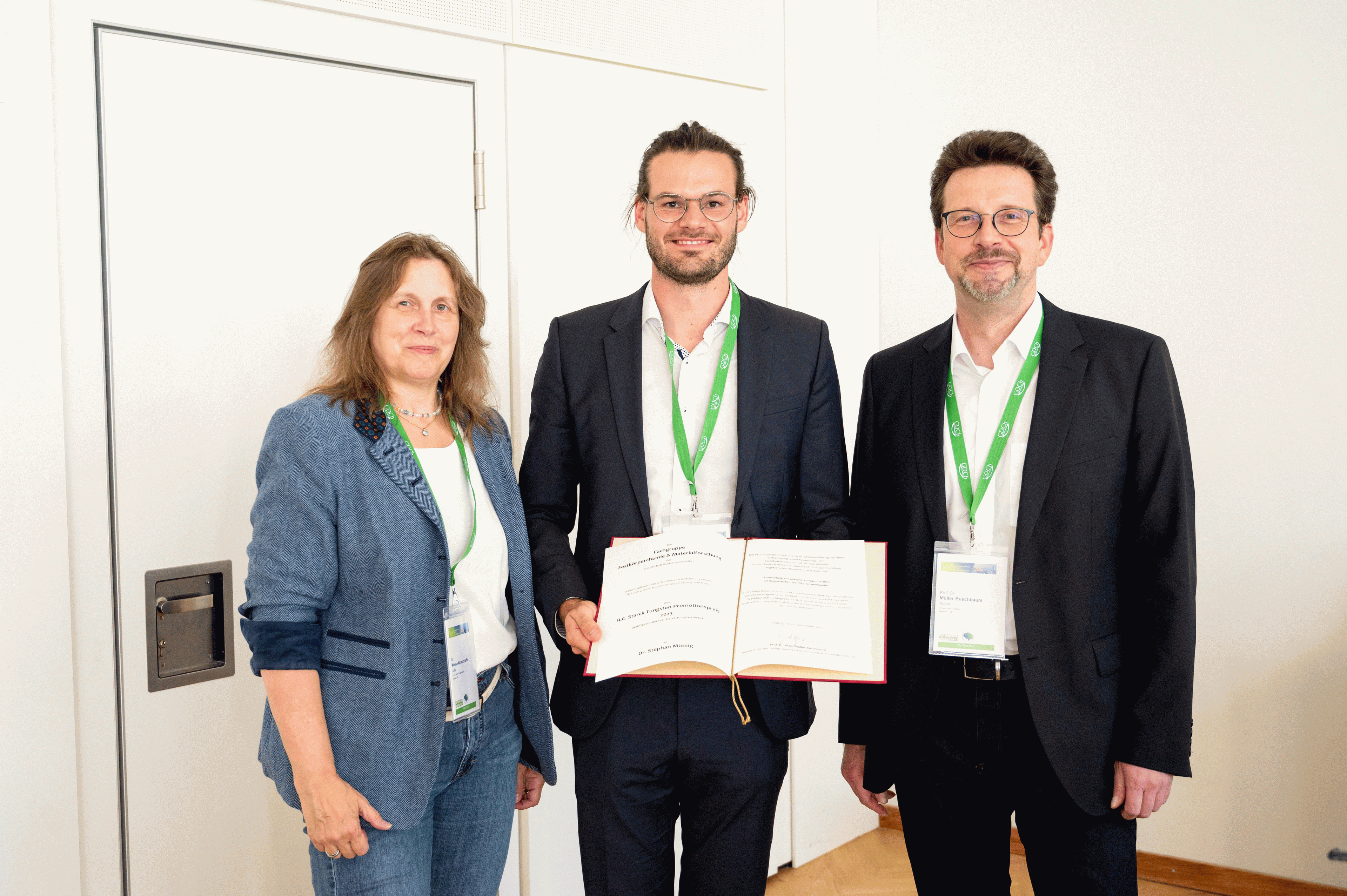 Der H.C. Starck Tungsten-Promotionspreis 2023 für Festkörperchemie und Materialforschung wurde anlässlich des GDCh-Wissenschaftsforums Chemie am 4.09.2023 in Leipzig an Dr. Stephan Müssig verliehen.