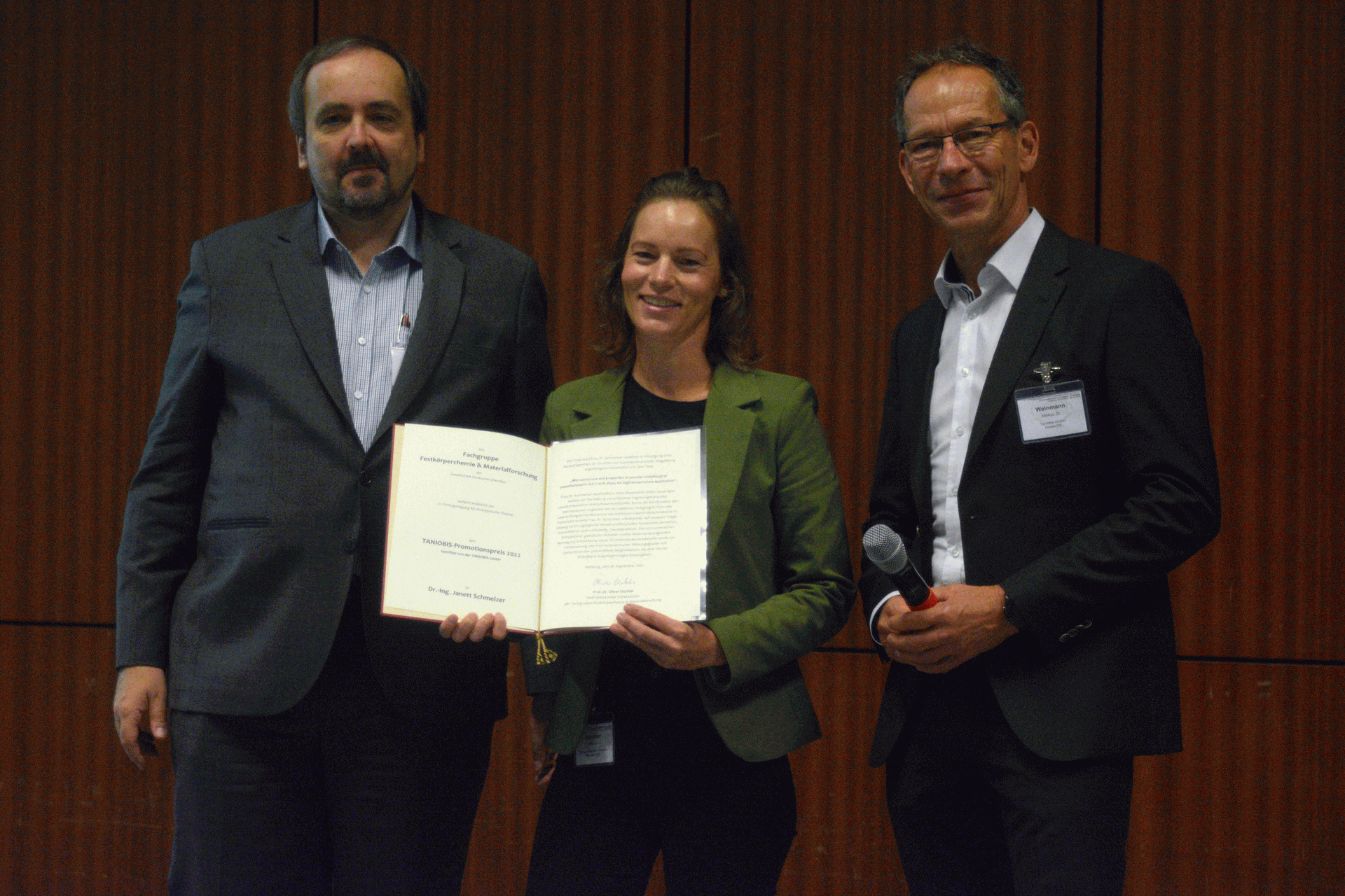 Der TANIOBIS-Promotionspreis für Festkörperchemie und Materialforschung wurde anlässlich der 21. Vortragstagung für Anorganische Chemie am 28.09.2022 in Marburg an Dr.-Ing Janett Schmelzer und Dr. Nicolas Zapp verliehen.