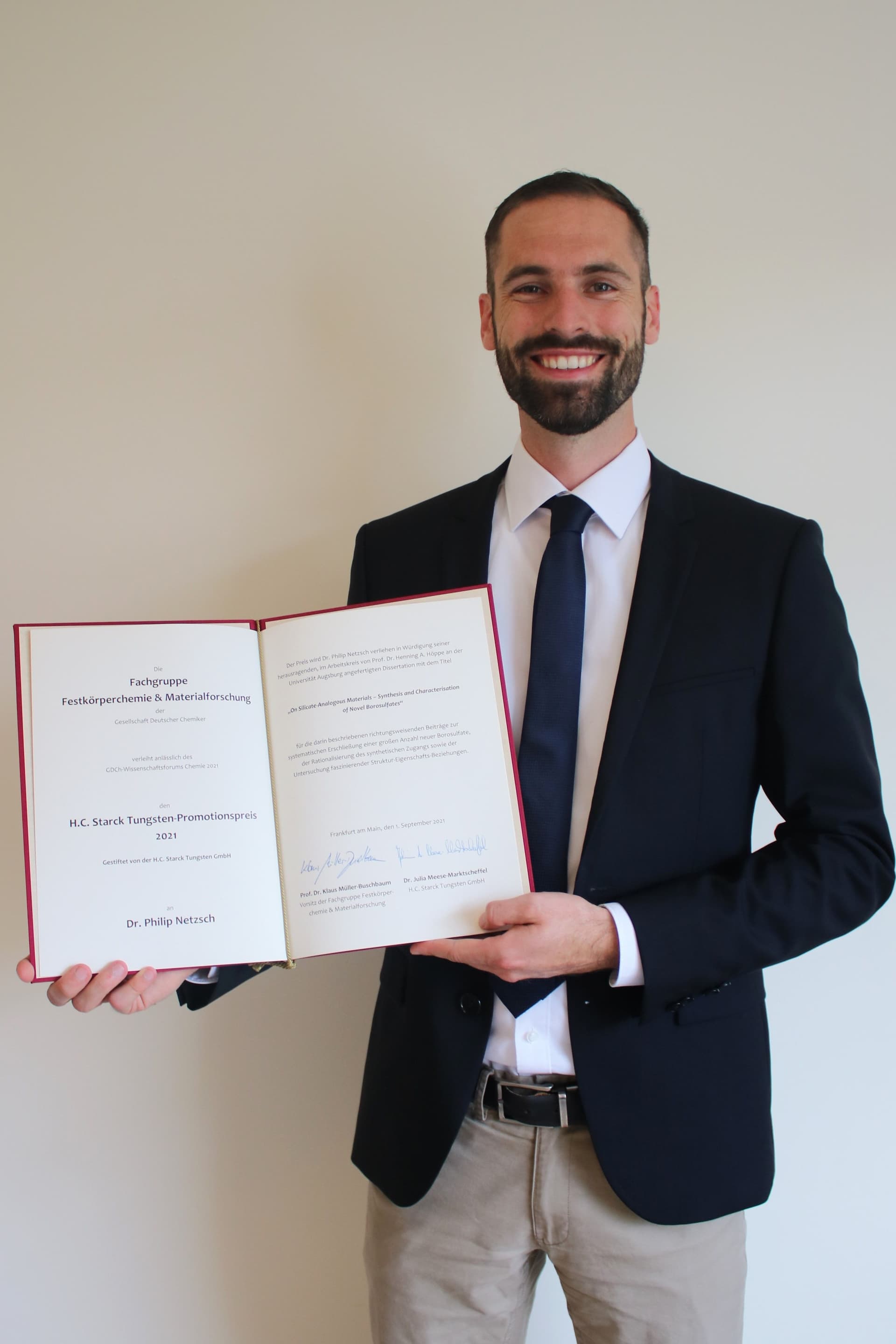Der H.C. Starck Tungsten-Promotionspreis, gestiftet von der Firma H.C. Starck Tungsten GmbH, für Festkörperchemie und Materialforschung wurde anlässlich des GDCh-Wissenschaftsforums Chemie 2021 an Dr. Lukas Mai und Dr. Philip Netzsch verliehen.