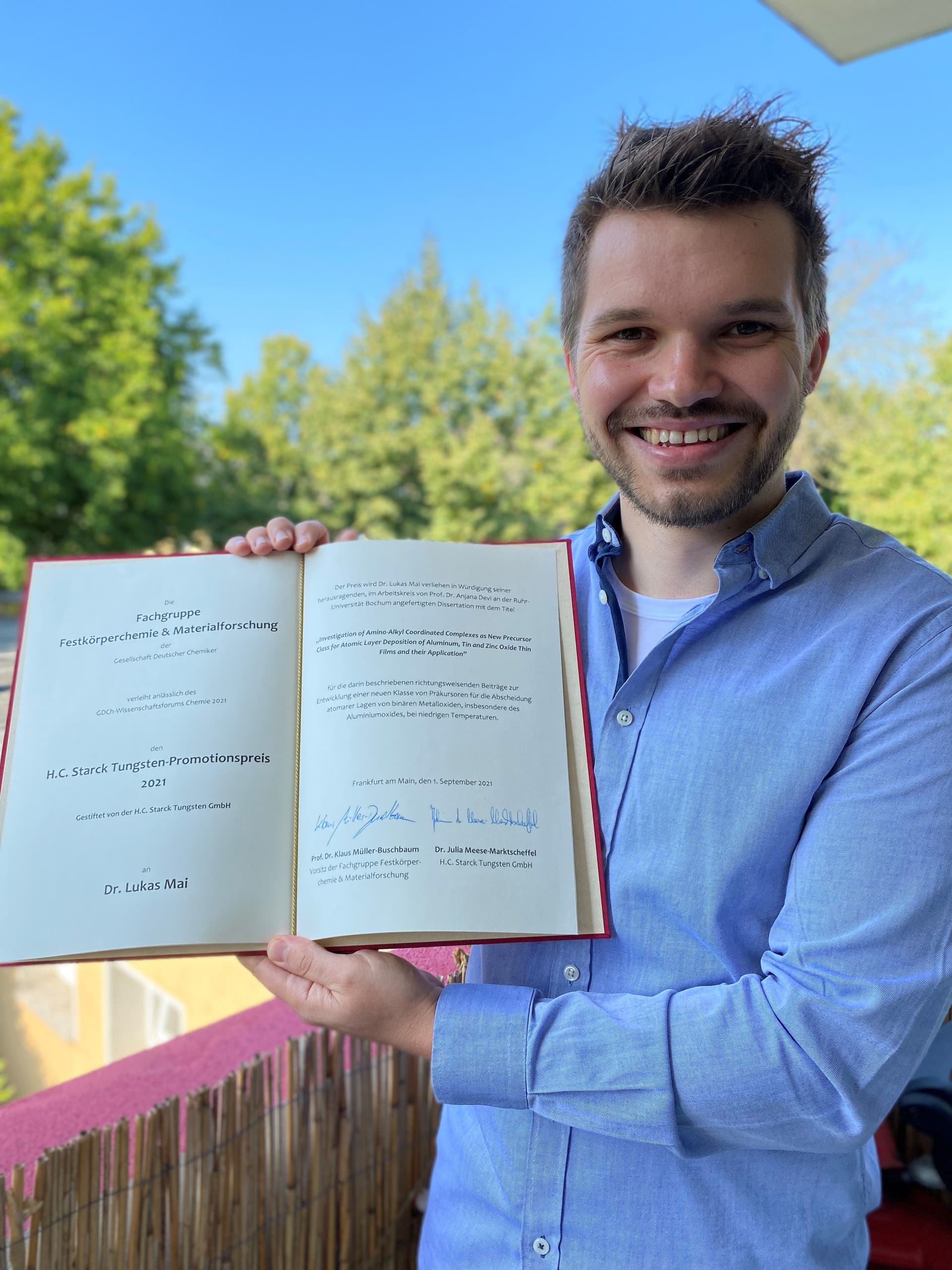 Herrn Dr. Lukas Mai in Würdigung seiner herausragenden Dissertation mit dem Titel: „Investigation of Amino-Alkyl Coordinated Complexes as New Precursor Class for Atomic Layer Deposition of Aluminum, Tin and Zinc Oxide Thin Films and their Application” für die darin beschriebenen richtungsweisenden Beiträge zur Entwicklung einer neuen Klasse von Präkursoren für die Abscheidung atomarer Lagen von binären Metalloxiden, insbesondere des Aluminiumoxides, bei niedrigen Temperaturen. Die Dissertation wurde im Arbeitskreis von Prof. Dr. Anjana Devi an der Ruhr-Universität Bochum angefertigt.