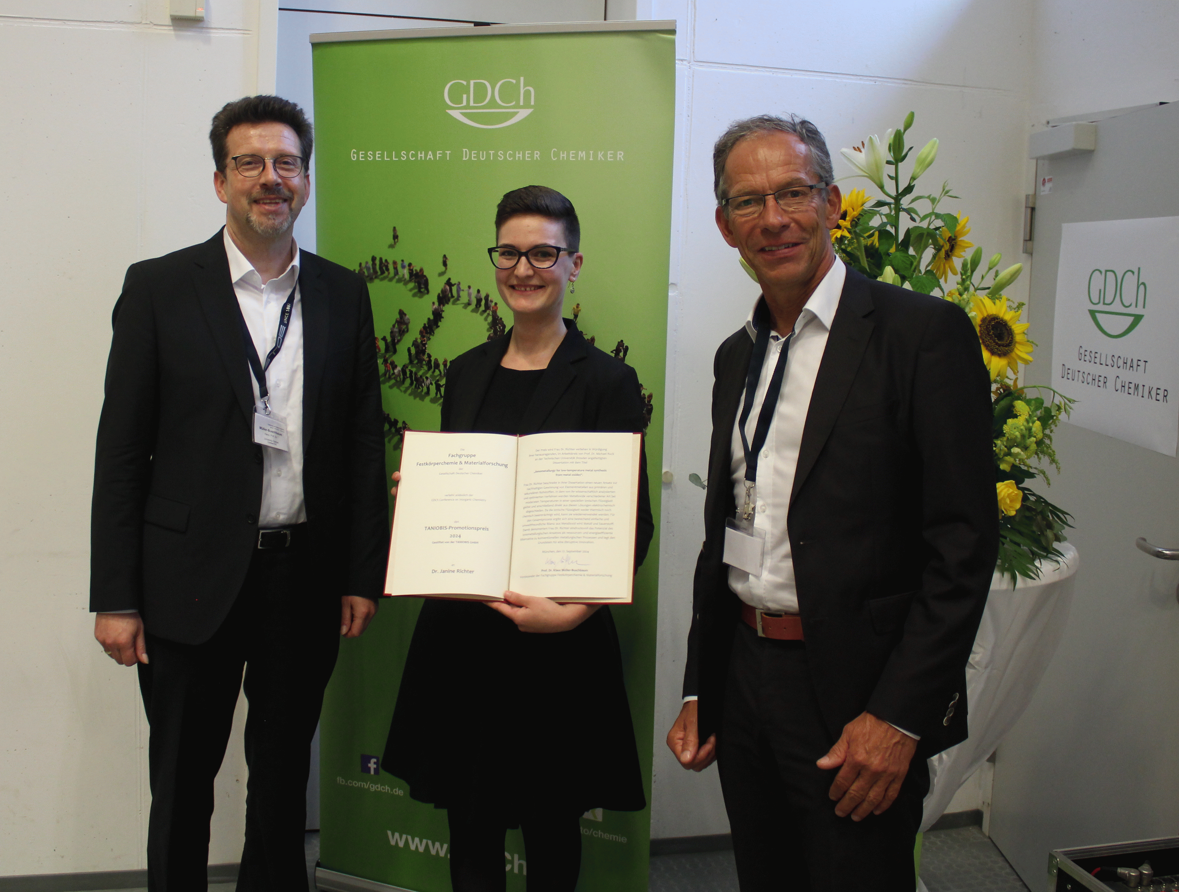 Der TANIOBIS-Promotionspreis 2024 für Festkörperchemie und Materialforschung wurde anlässlich des GDCh Conference on Inorganic Chemistry am 17.09.2024 in München an Dr. Janine Richter verliehen:
