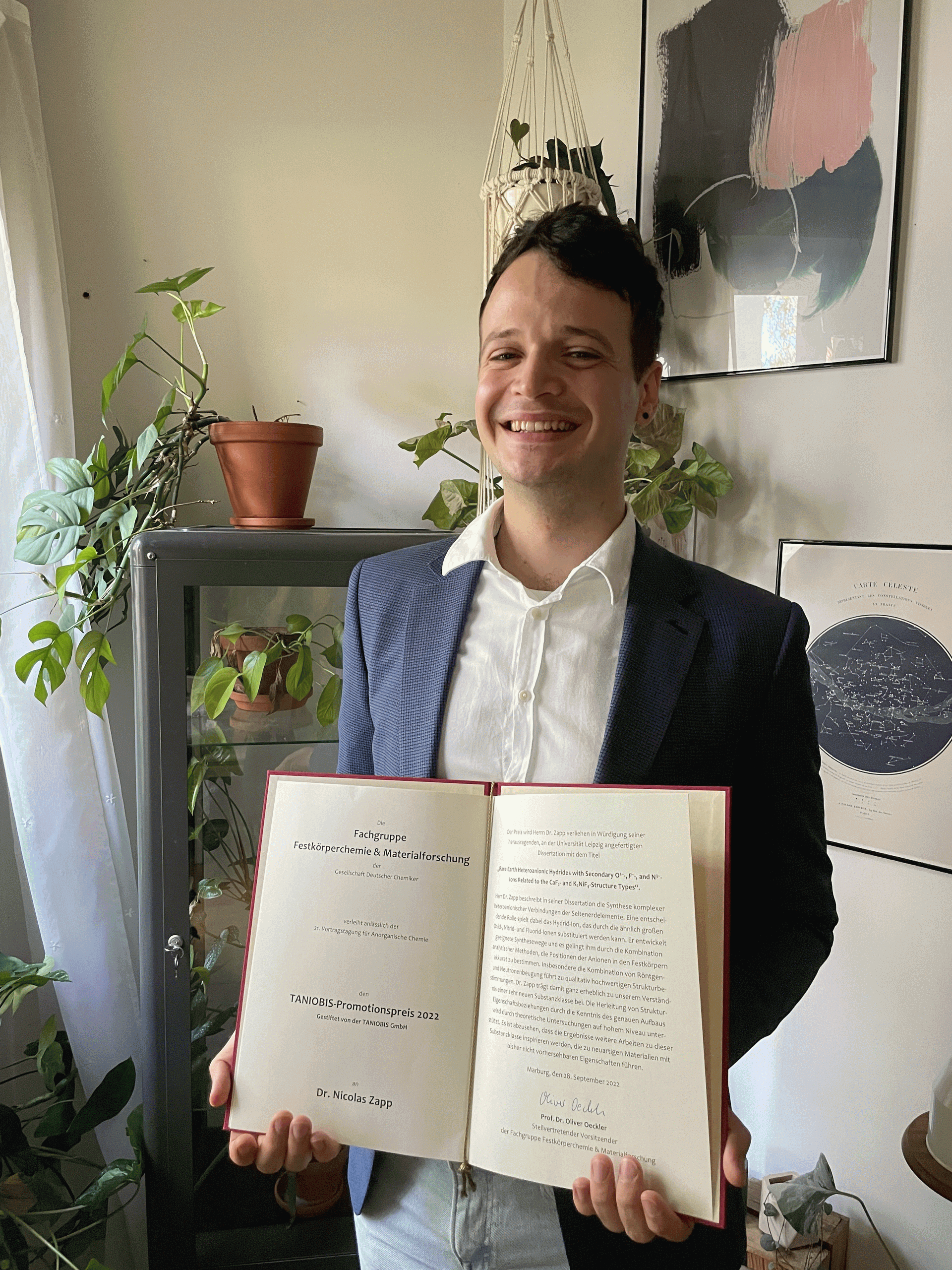 Dr. Nicolas Zapp "in Würdigung seiner herausragenden, an der Universität Leipzig angefertigten Dissertation mit dem Titel „Rare Earth Heteroanionic Hydrides with Secondary O2– , F– , and N3– Ions Related to the CaF2 and K2NiF4 Structure Types“. Herr Dr. Zapp beschreibt in seiner Dissertation die Synthese komplexer heteroanionischer Verbindungen der Seltenerdelemente. Eine entschei-dende Rolle spielt dabei das Hydrid-Ion, das durch die ähnlich großen Oxid-, Nitrid- und Fluorid-Ionen substituiert werden kann. Er entwickelt geeignete Synthesewege und es gelingt ihm durch die Kombination analytischer Methoden, die Positionen der Anionen in den Festkörpern akkurat zu bestimmen. Insbesondere die Kombination von Röntgen- und Neutronenbeugung führt zu qualitativ hochwertigen Strukturbe-stimmungen. Dr. Zapp trägt damit ganz erheblich zu unserem Verständ-nis einer sehr neuen Substanzklasse bei. Die Herleitung von Struktur-Eigenschaftsbeziehungen durch die Kenntnis des genauen Aufbaus wird durch theoretische Untersuchungen auf hohem Niveau unter¬stützt. Es ist abzusehen, dass die Ergebnisse weitere Arbeiten zu dieser Substanzklasse inspirieren werden, die zu neuartigen Materialien mit bisher nicht vorhersehbaren Eigenschaften führen."