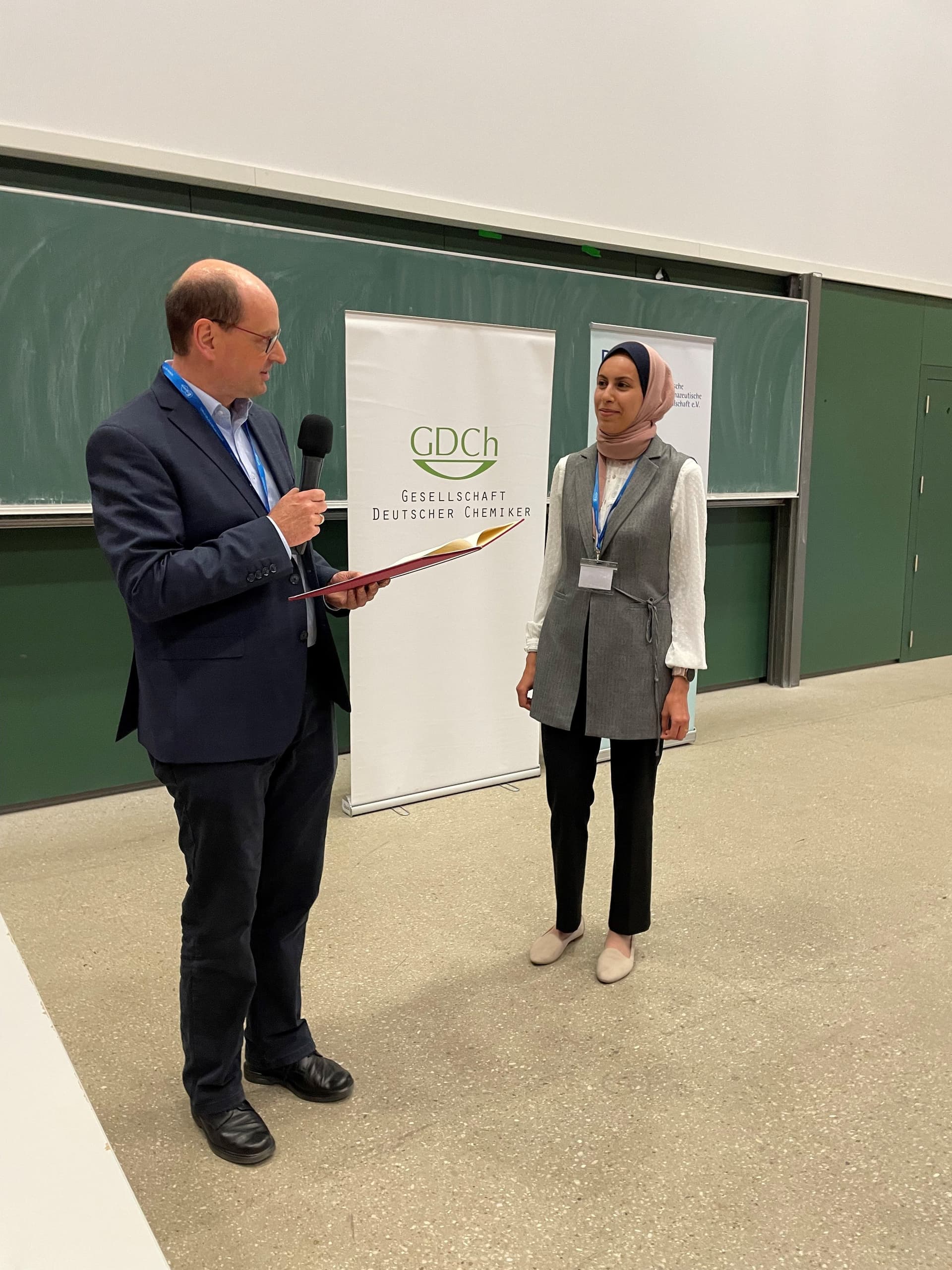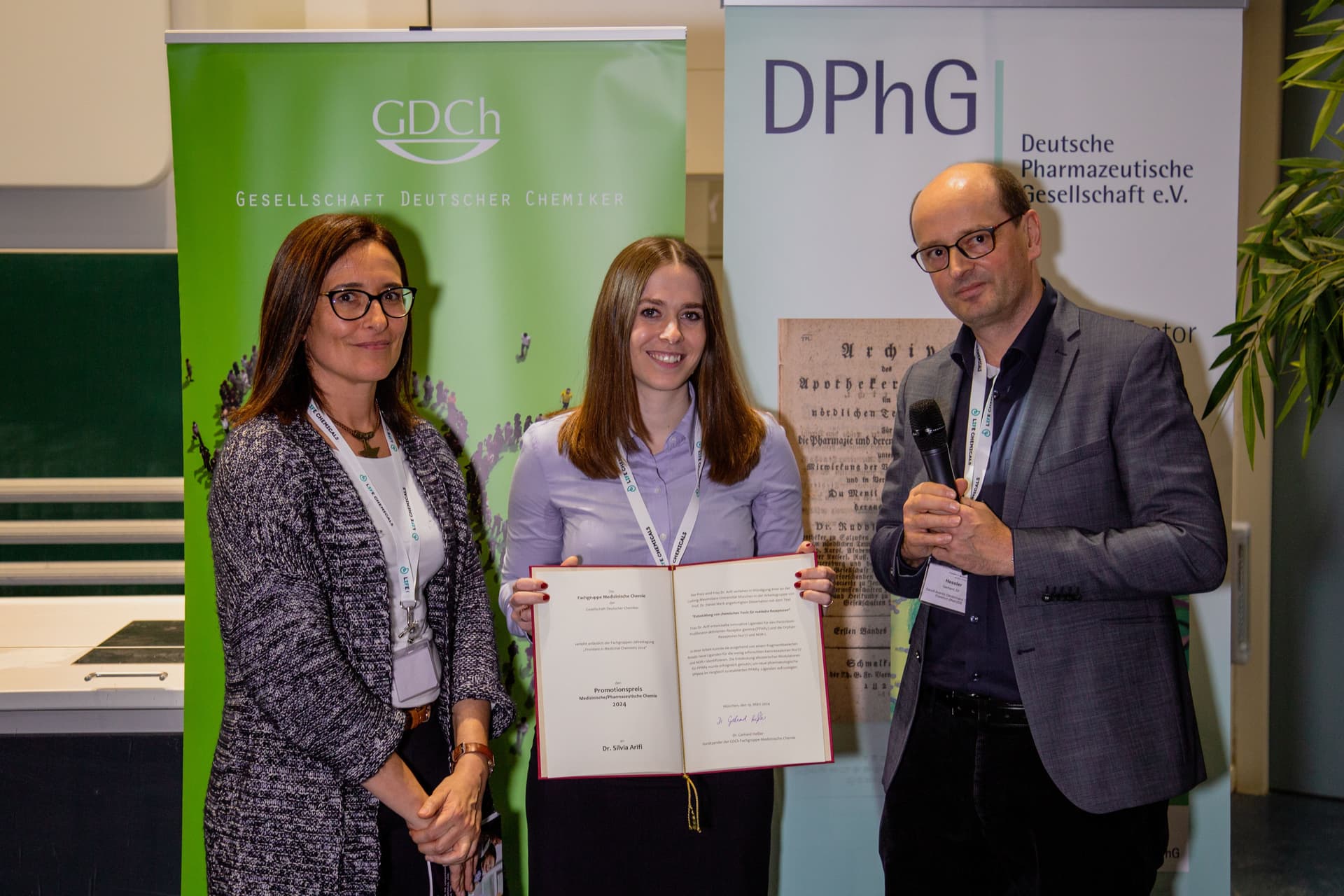 Dr. Silvia Arifi: in Würdigung ihrer Dissertation mit dem Titel Entwicklung von chemischen Tools für nukleäre Rezeptoren. "Frau Dr. Arifi entwickelte innovative Liganden für den Peroxisom-Proliferator-aktivierten Rezeptor gamma (PPARγ) und die Orphan-Rezeptoren Nur77 und NOR-1. In ihrer Arbeit konnte sie ausgehend von einem fragmentbasierten Ansatz neue Liganden für die wenig erforschten Kernrezeptoren Nur77 und NOR-1 identifizieren. Die Entdeckung allosterischer Modulatoren für PPARγ wurde erfolgreich genutzt, um neue pharmakologische Effekte im Vergleich zu etablierten PPARγ -Liganden aufzuzeigenn."