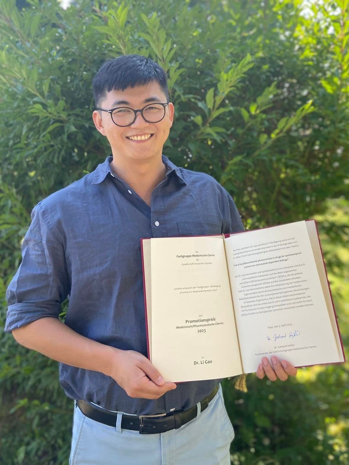 Herrn Dr. Gao: in Würdigung seiner Dissertation mit dem Titel Use of styrylbenzothiazole photoswitches in drugs for spatiotemporal control over microtubule-dependent biology. "Herr Dr. Gao entwickelte und synthetisierte in-vivo-wirksame und durch Licht schaltbare Substanzen auf der Basis sogenannter „styryl[benzo]thiazole photoswitches“ (S[B]Ts), die die präzise Kontrolle biologischer Effekte auf das Zytoskelett erlauben. Herr Dr. Gao demonstrierte dabei die Verbesserung der molekularen Eigenschaften durch photochemische und metabolische Belastbarkeitstests bis hin zu komplexen biologischen Anwendungen im lebenden Organismus. Die in dieser Arbeit beschriebenen Biomoleküle sind die ersten durch Licht schaltbaren Substanzen, die mit Fluoreszenz-Protein-Imaging kompatibel sind und somit für hoch präzise Studien an biologischen Systemen verwendet werden können."