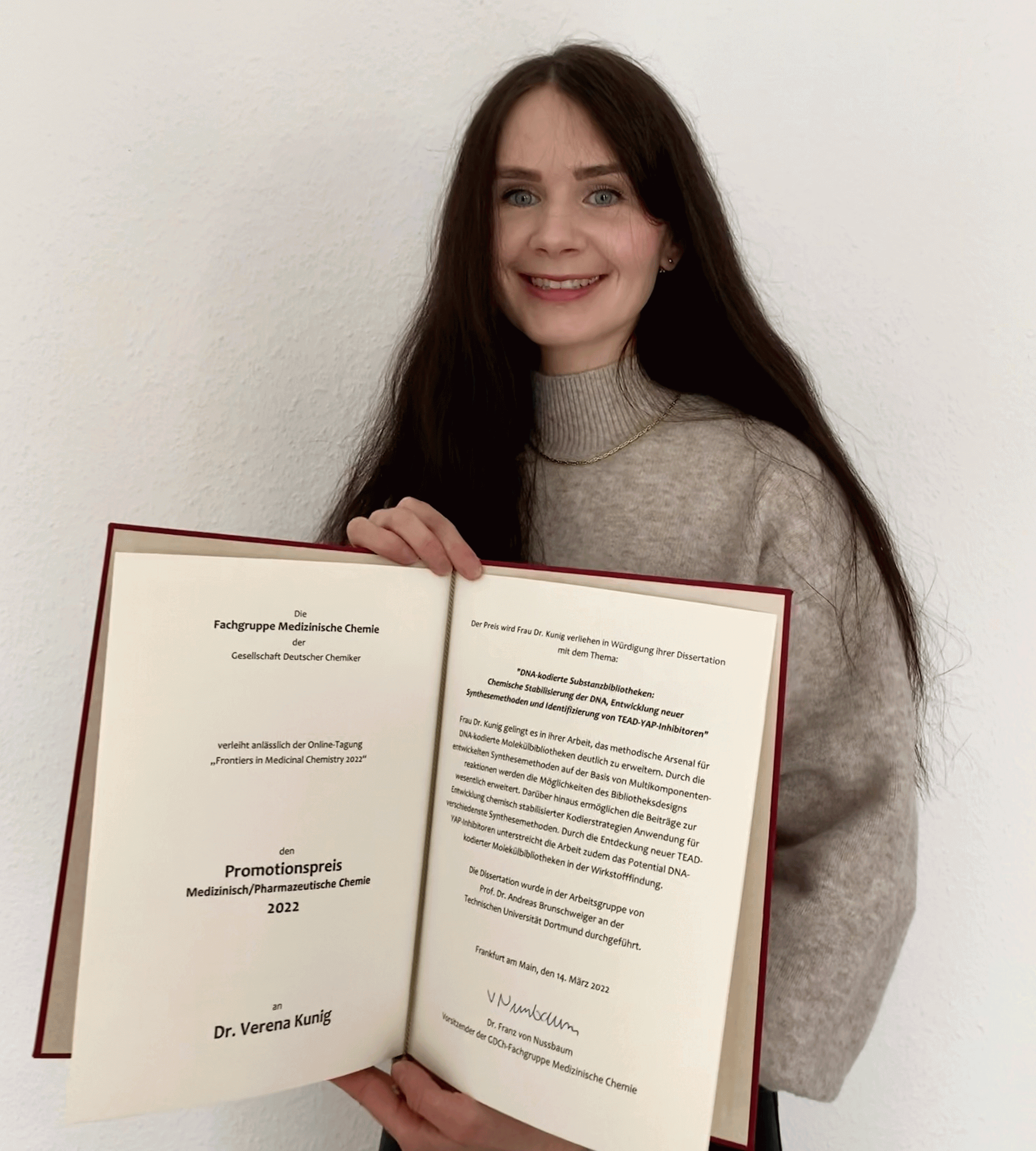 Dr. Kunig: in Würdigung ihrer Dissertation mit dem Titel DNA-kodierte Substanzbibliotheken: Chemische Stabilisierung der DNA, Entwicklung neuer Synthesemethoden und Identifizierung von TEAD-YAP-Inhibitoren. "Frau Dr. Kunig gelingt es in ihrer Arbeit, das methodische Arsenal für DNA-kodierte Molekülbibliotheken deutlich zu erweitern. Durch die entwickelten Synthesemethoden auf der Basis von Multikomponentenreaktionen werden die Möglichkeiten des Bibliotheksdesigns wesentlich erweitert. Darüber hinaus ermöglichen die Beiträge zur Entwicklung chemisch stabilisierter Kodierstrategien Anwendung für verschiedenste Synthesemethoden. Durch die Entdeckung neuer TEAD-YAP-Inhibitoren unterstreicht die Arbeit zudem das Potential DNA-kodierter Molekülbibliotheken in der Wirkstofffindung. Die Dissertation wurde in der Arbeitsgruppe von Prof. Dr. Andreas Brunschweiger an der Technischen Universität Dortmund durchgeführt."