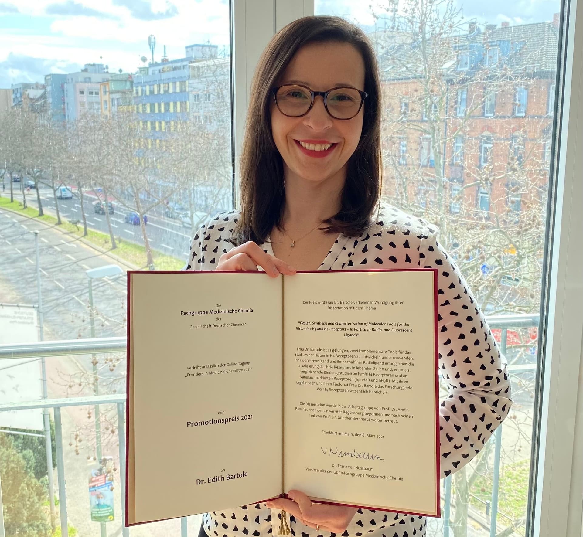 Dr. Bartole: in Würdigung ihrer Dissertation mit dem Titel Design, Synthesis and Characterization of Molecular Tools for the Histamine H3 and H4 Receptors – In Particular Radio- and Fluorescent Ligands. "Frau Dr. Bartole gelang es, zwei komplementäre Tools für das Studium der Histamin H4 Rezeptoren zu entwickeln und anzuwenden. Ihr Fluoreszenzligand und ihr hochaffiner Radioligand ermöglichen die Lokalisierung des hH4 Rezeptors in lebenden Zellen und, erstmals, vergleichende Bindungsstudien an h/m/rH4 Rezeptoren und an NanoLuc-markierten Rezeptoren (h/mH4R und hH3R). Mit ihren Ergebnissen und ihren Tools hat Frau Dr. Bartole das Forschungsfeld der H4 Rezeptoren wesentlich bereichert. Die Dissertation wurde in der Arbeitsgruppe von Prof. Dr. Armin Buschauer an der Universität Regensburg begonnen und nach seinem Tod von Prof. Dr. Günther Bernhardt weiter betreut."