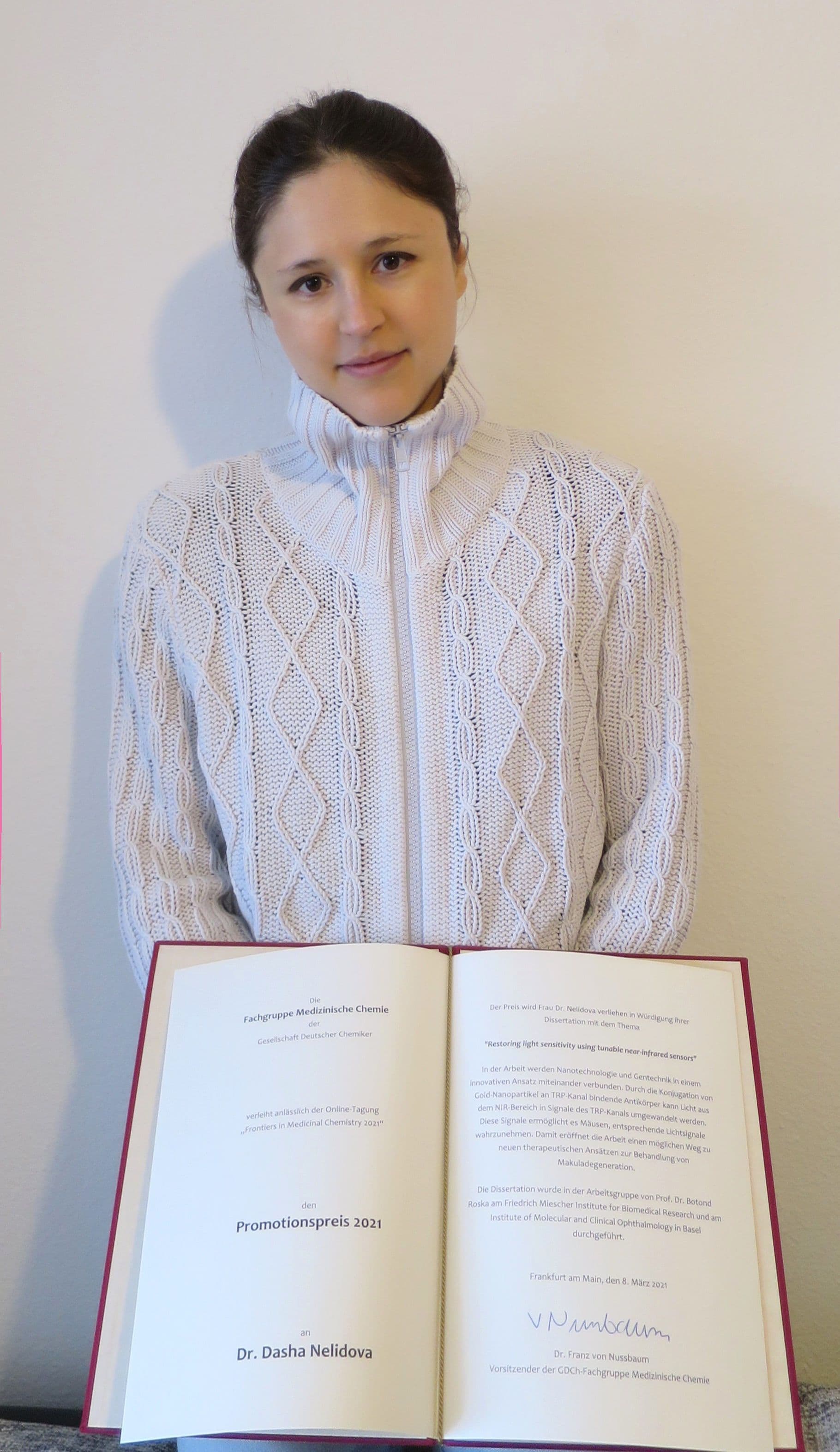 Dr. Nelidova: in Würdigung ihrer Dissertation mit dem Titel Restoring light sensitivity using tunable near-infrared sensors. "In der Arbeit werden Nanotechnologie und Gentechnik in einem innovativen Ansatz miteinander verbunden. Durch die Konjugation von Gold-Nanopartikel an TRP-Kanal bindende Antikörper kann Licht aus dem NIR-Bereich in Signale des TRP-Kanals umgewandelt werden. Diese Signale ermöglicht es Mäusen, entsprechende Lichtsignale wahrzunehmen. Damit eröffnet die Arbeit einen möglichen Weg zu neuen therapeutischen Ansätzen zur Behandlung von Makuladegeneration. Die Dissertation wurde in der Arbeitsgruppe von Prof. Dr. Botond Roska am Friedrich Miescher Institute for Biomedical Research und am Institute of Molecular and Clinical Ophthalmology in Basel durchgeführt."