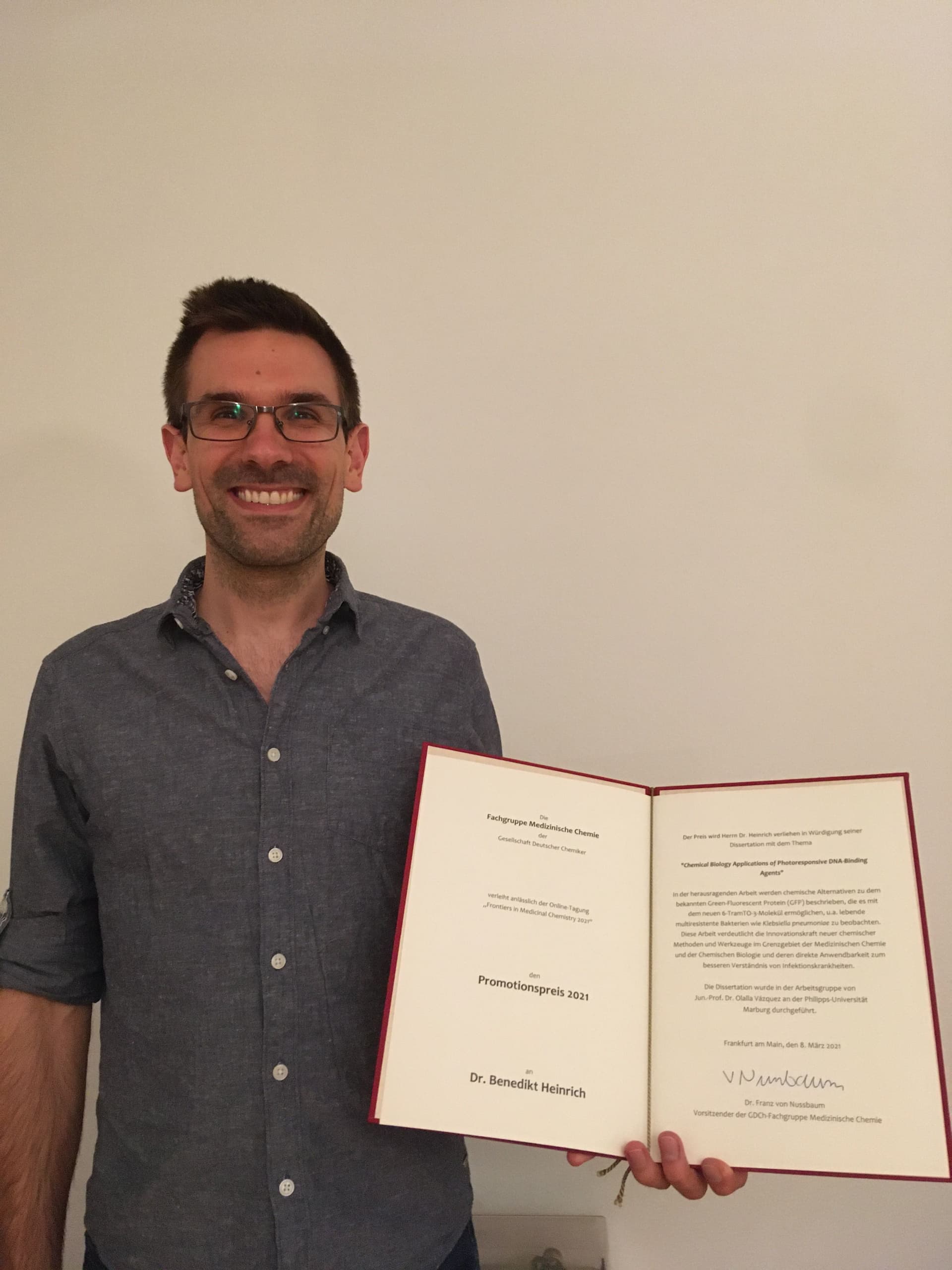 Dr. Heinrich: in Würdigung seiner Dissertation mit dem Titel Chemical Biology Applications of Photoresponsive DNA-Binding Agents. "In der herausragenden Arbeit werden chemische Alternativen zu dem bekannten Green-Fluorescent Protein (GFP) beschrieben, die es mit dem neuen 6 TramTO 3-Molekül ermöglichen, u.a. lebende multiresistente Bakterien wie Klebsiella pneumoniae zu beobachten. Diese Arbeit verdeutlicht die Innovationskraft neuer chemischer Methoden und Werkzeuge im Grenzgebiet der Medizinischen Chemie und der Chemischen Biologie und deren direkte Anwendbarkeit zum besseren Verständnis von Infektionskrankheiten. Die Dissertation wurde in der Arbeitsgruppe von Jun.-Prof. Dr. Olalla Vázquez an der Philipps-Universität Marburg durchgeführt."