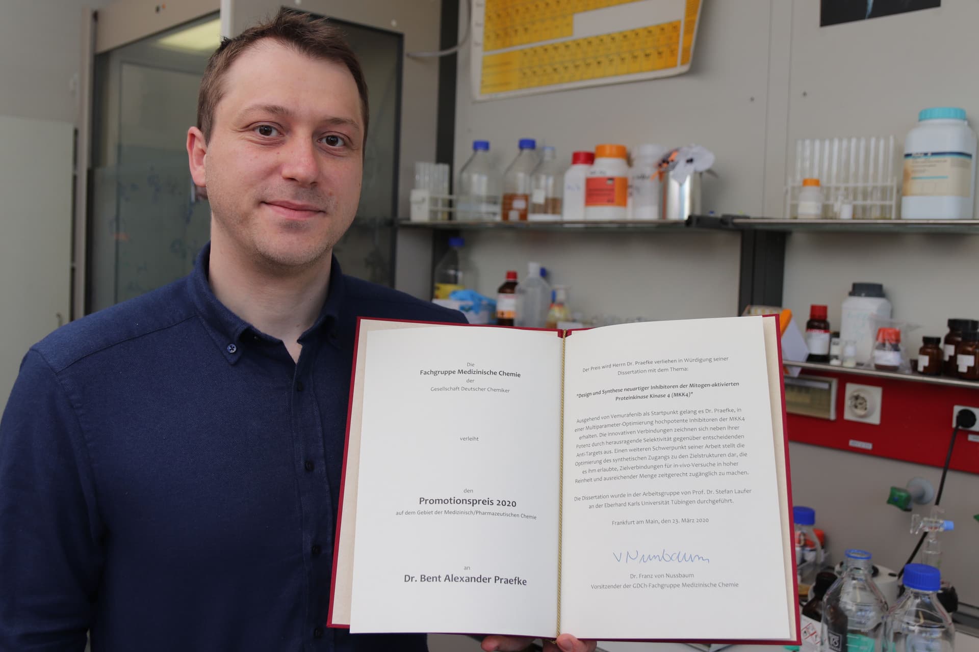 Dr. Bent Alexander Praefke in Würdigung seiner Dissertation mit dem Titel Design und Synthese neuartiger Inhibitoren der Mitogen-aktivierten Proteinkinase Kinase 4 (MKK4). "Ausgehend von Vemurafenib als Startpunkt gelang es Dr. Praefke, in einer Multiparameter-Optimierung hochpotente Inhibitoren der MKK4 erhalten. Die innovativen Verbindungen zeichnen sich neben ihrer Potenz durch herausragende Selektivität gegenüber entscheidenden Anti-Targets aus. Einen weiteren Schwerpunkt seiner Arbeit stellt die Optimierung des synthetischen Zugangs zu den Zielstrukturen dar, die es ihm erlaubte, Zielverbindungen für in-vivo-Versuche in hoher Reinheit und ausreichender Menge zeitgerecht zugänglich zu machen. Die Dissertation wurde in der Arbeitsgruppe von Prof. Dr. Stefan Laufer an der Eberhard Karls Universität Tübingen durchgeführt."