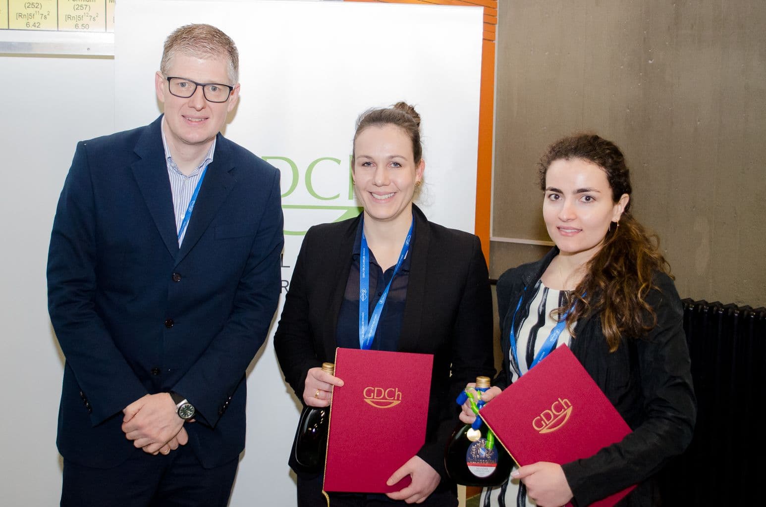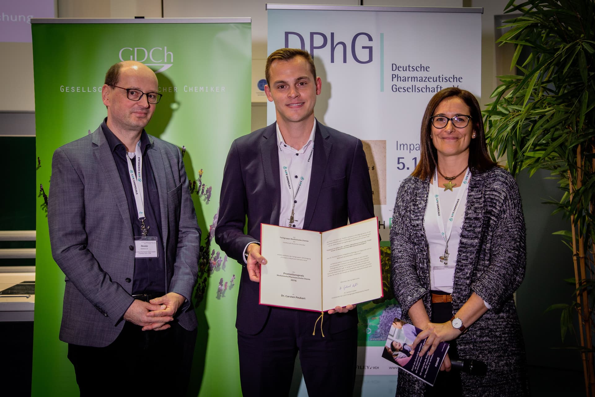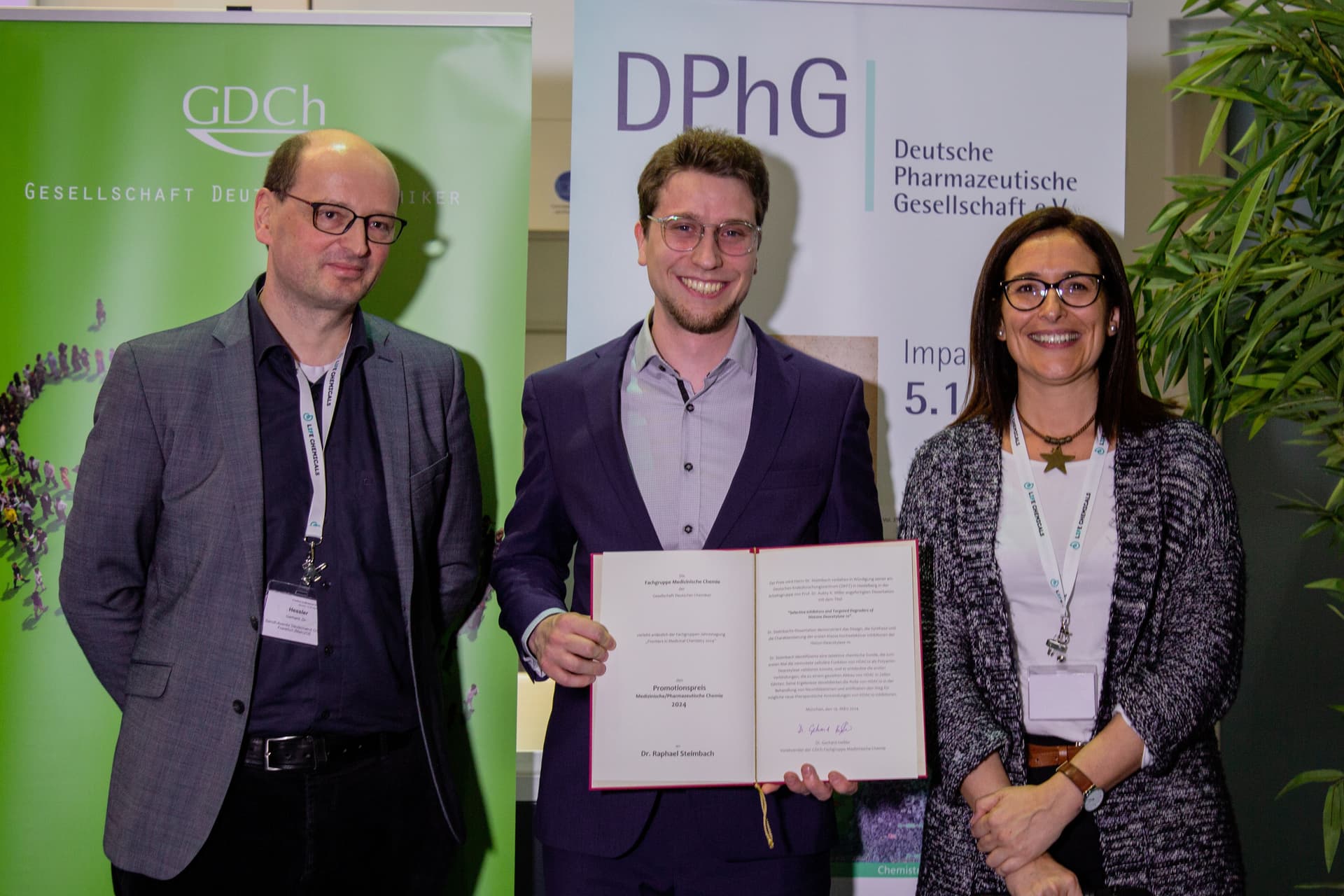 Der Promotionspreis 2024 wurde am 19. März 2024 anlässlich der Fachgruppen-Jahrestagung "Frontiers in Medicinal Chemistry 2024" in München an Dr. Silvia Arifi, Dr. Carsten Peukert und Dr. Raphael Steimbach verliehen.