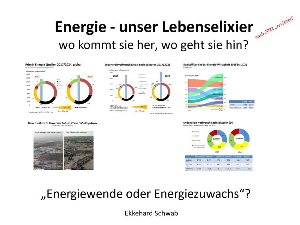 Ohne Energie kein Leben. Über Jahrtausende nutzte die Menschheit lediglich Muskelkraft (einschließlich Sklaven), nachwachsende Rohstoffe, Wasserkraft und Windenergie als Energiequellen. Die zur Verfügung stehende Energiemenge war jedoch stets begrenzt. Dies änderte sich dramatisch, nachdem es gelang, die scheinbar unlimitiert zur Verfügung stehenden fossilen Energieträger Kohle, Erdöl und Erdgas auszubeuten. Die exzessive Nutzung dieser Quellen hat jedoch inzwischen die Zusammensetzung der Erd-Atmosphäre so verändert, dass global mit gravierenden klimatischen Veränderungen gerechnet werden muss. Der Vortrag zeigt, welche Dimensionen beim globalen Umbau des fossilen auf ein wieder nachhaltiges Energiesystem bewältigt werden müssen, und welche Entwicklungen es seit der „Erstauflage“ des Vortrags im Jahr 2021 sowohl global als auch in Deutschland gegeben hat.