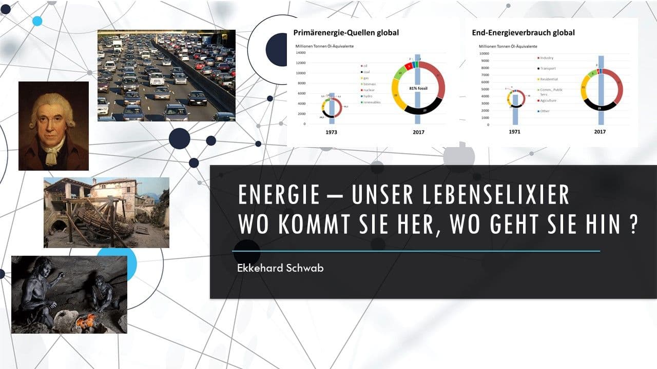 Ohne Energie kein Leben. Über Jahrtausende waren nachwachsende Rohstoffe, Wasserkraft und Windenergie die einzigen Energiequellen für die Entwicklung der Menschheit. Die zur Verfügung stehende Energiemenge war trotz immer effizienterer Nutzung jedoch stets begrenzt. Dies änderte sich dramatisch, nachdem durch die Dampfmaschine von James Watt die Ausbeutung scheinbar unbegrenzter Kohlevorräte möglich wurde. Später kamen Technologien zur Öl- und Erdgasförderung hinzu. Die exzessive Nutzung dieser Quellen hat inzwischen die Zusammensetzung der Erd-Atmosphäre so verändert, dass global mit gravierenden klimatischen Veränderungen gerechnet werden muss. Der Vortrag zeigt auf, welche Dimensionen beim globalen Umbau des fossilen auf ein wieder nachhaltiges Energiesystem bewältigt werden müssen.
