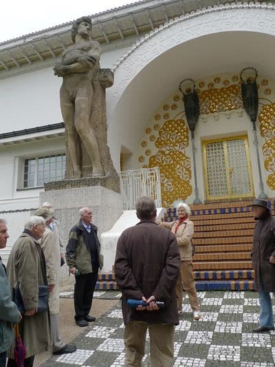 Leider wurden die Jugendstil-Villen auf der Mathildenhöhe im zweiten Weltkrieg sehr zerstört. Die Pensionäre konnten zwei der Künstlerhäuser besichtigen und dort einen Eindruck gewinnen - wiederum mit einiger Phantasie - wie die Philosophie des Jugendstils, die Einheit von Künstler und Handwerker, den Bereich des täglichen Lebens geformt hat. Gerade diese Einheit hat ja dann wenig später das Bauhaus in Weimar geprägt.