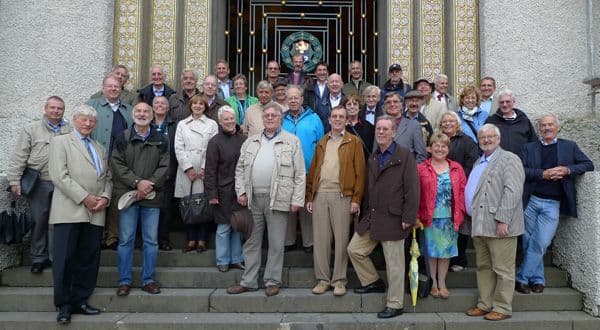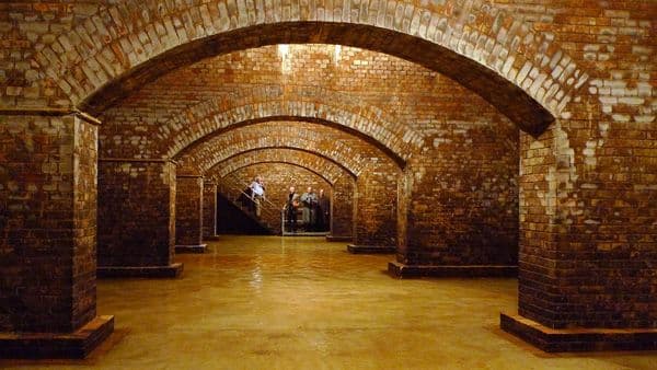 Ein Faktor der Exkursion konnte trotz sorgfältiger Planung nicht organisiert werden, nämlich das Wetter. Die Vision war ein heißer, trockener Hochsommertag, die Realität kalt und nass! Passend zur Vision schloss ein besonderer Leckerbissen die Führung ab. Als höchster Punkt von Darmstadt war die Mathildenhöhe prädestiniert für ein großes Wasserreservoir. Das wurde 1880 gebaut und fasste fast 5000 m3. Heute bildet die denkmalgeschützte Anlage das Fundament des großen Ausstellungsgebäudes. Das Wasser steht in den Katakomben nur noch 30 cm hoch. Welch ein Labsal nach einem heißen Besichtigungstag! Der Enthusiasmus der Pensionäre für die Erfrischung hielt sich an diesem kühlen, regnerischen Tag doch sehr in Grenzen!