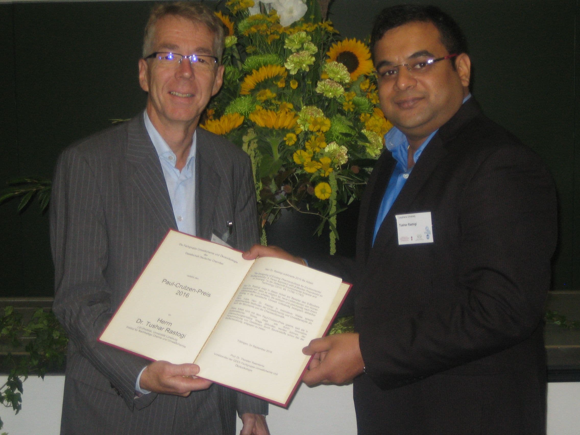 Der Preis wurde im Rahmen der Tagung "Viele Stoffe – großes Risiko? Wie relevant sind (Spuren-)Stoffe für Mensch und Umwelt" (5.-8.09.2016 in Tübingen) an Dr. Tushar Rastogi (Institut für Nachhaltige Chemie und Umweltchemie der Leuphana Universität Lüneburg) für die Publikation "Re-Designing of Existing Pharmaceuticals for Environmental Biodegradability: A Tiered Approach with β-Blocker Propranolol as an Example" (Environ. Sci. Technol. 2015, 49, 11756–11763) vergeben.