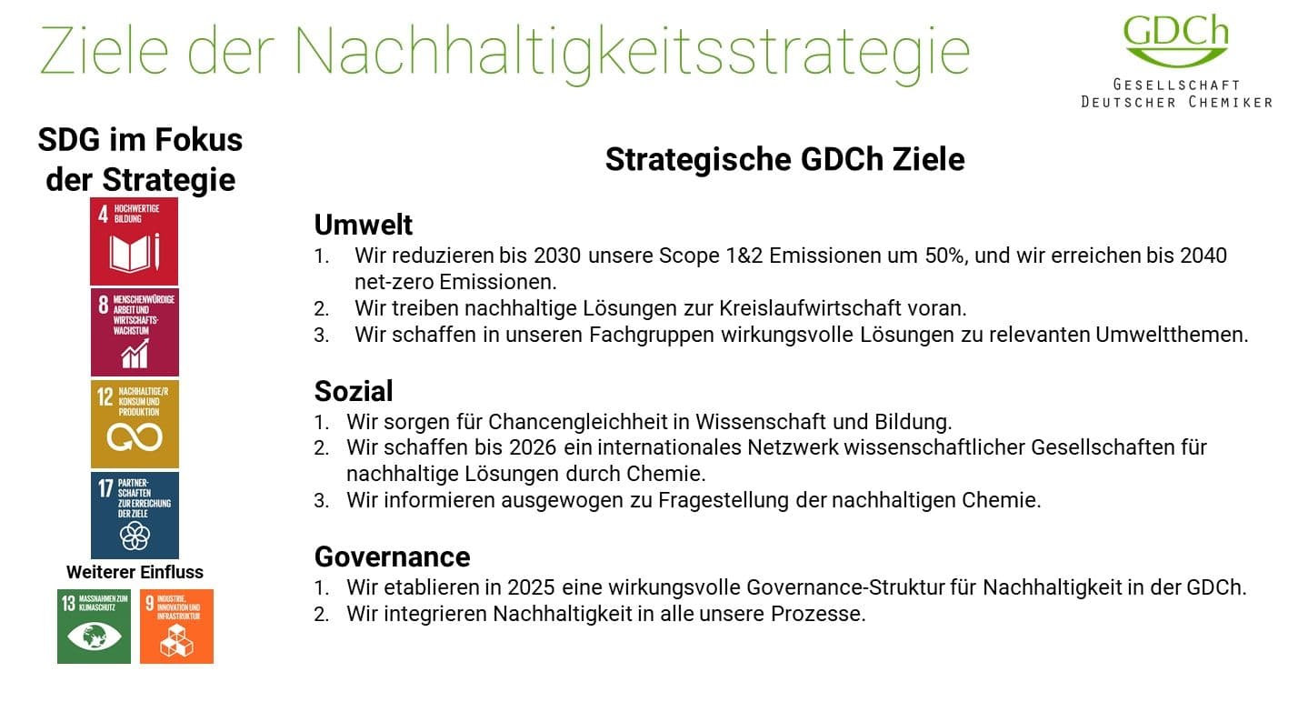 Aus diesem Grund freue ich mich, Ihnen heute unsere Nachhaltigkeitsstrategie vorzustellen. Nachhaltigkeit ist für uns nicht nur ein Schlagwort, sondern ein Leitprinzip, das wir in all unseren Aktivitäten verankern wollen. Ziel unserer Strategie ist es, Nachhaltigkeit in der GDCh in all unseren Prozessen zu verankern. Hierbei wollen wir basierend auf unseren Kompetenzen Informationen bereitstellen und so helfen, Lösungen zu schaffen und zum nachhaltigen Handeln in Wissenschaft, Wirtschaft und Politik beizutragen.