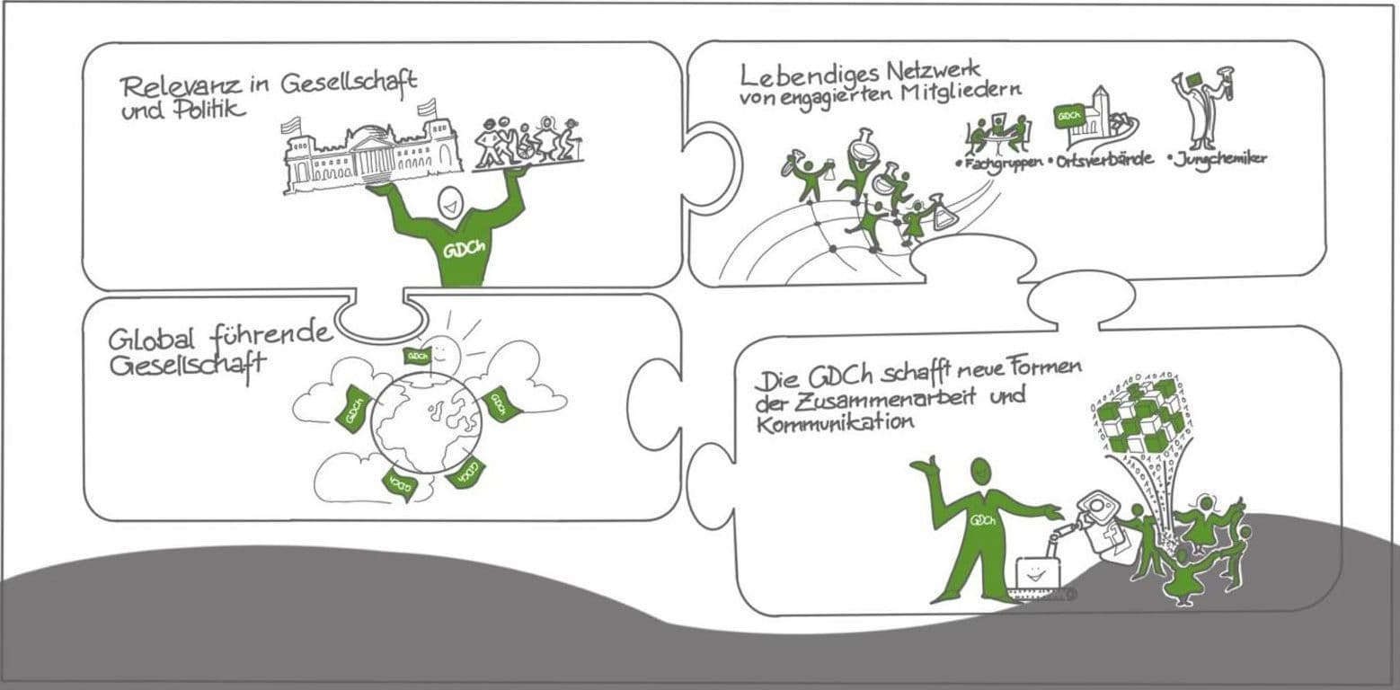 Die Leitbilder der GDCh wurden bei einem Strategie-Entwicklungs-Workshop im November 2018 von einer moderierten Arbeitsgruppe entwickelt. Mitglieder der Arbeitsgruppe waren neben dem Präsidenten und dem Geschäftsführer der GDCh mehrere Mitglieder des Vorstands, Mitarbeiter:innen der Geschäftsstelle und weitere Vertreter:innen verschiedener GDCh-Strukturen. Gemäß der Vision "Wir entdecken Chemie für eine bessere Welt" definierten die Teilnehmenden die ersten drei Leitbilder. Das vierte Leitbild zur Kommunikation wurde bei einem digitalen Workshop im Dezember 2021 entwickelt.